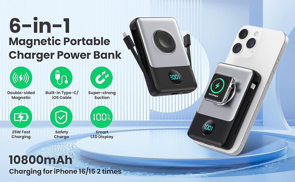 La Powerbank 2026 es la batería portátil más avanzada del año, diseñada para quienes necesitan energía constante para sus dispositivos móviles y smartwatch. Con su gran capacidad, carga inalámbrica independiente y cables incorporados, es perfecta para viajes, trabajo o cualquier momento fuera de casa.